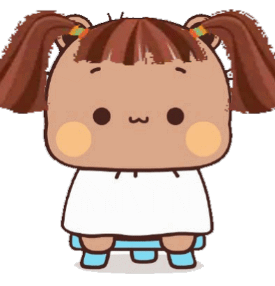 Cute cartoon girl Bubu Dudu with brown pigtails, wearing a white shirt and blue pants, standing with a sweet expression.