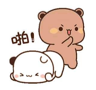 Bubu the brown bear playfully slaps Dudu the white panda, who is lying down.
