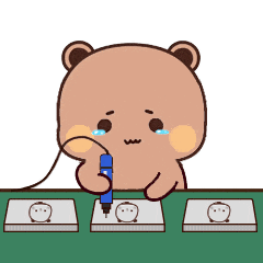 Bubu Dudu, the adorable cartoon teddy bear from Sseeyall, sits at a table, diligently writing with a pen.