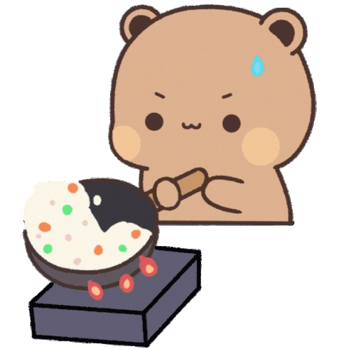 Bubu Dudu, a cute cartoon bear, is diligently cooking colorful rice in a frying pan on a small stove, looking focused.