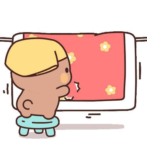 Bubu Dudu, a cute cartoon character, stands on a stool, curiously looking at a red blanket with yellow flowers.