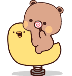 Bubududu Panda, a cute brown bear, sits on a yellow duck spring rider, enjoying a lollipop.
