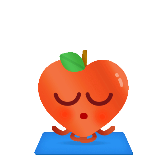 A cute heart-shaped apple character, Buccia Mela, meditating and floating with golden sparkles, embodying peace and wellness.