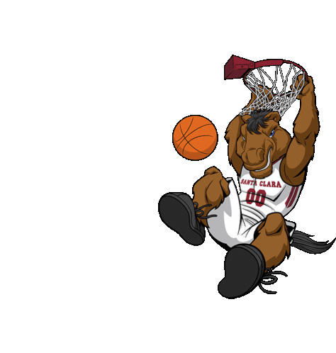 Bucky The Bronco, Santa Clara University's mascot, energetically dunks a basketball in his white jersey.