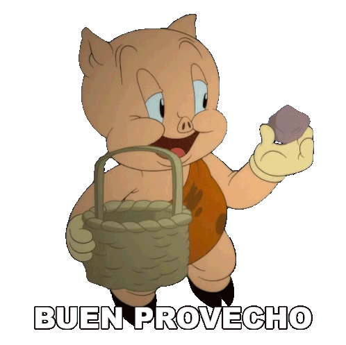 Porky Pig, holding a basket and a rock, smiles and says 'Buen Provecho' (Enjoy your meal).