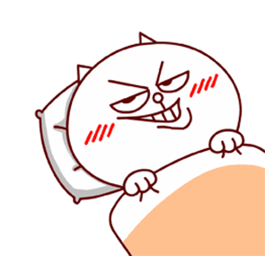 A mischievous cartoon cat character in bed, under a blanket, with a sly expression, wishing good night.