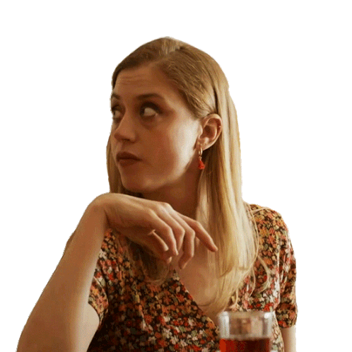 A woman with blonde hair and red earrings reacts with a 'Bueno' expression, raising her eyebrows in a 'well, okay' gesture.
