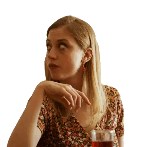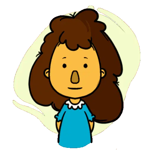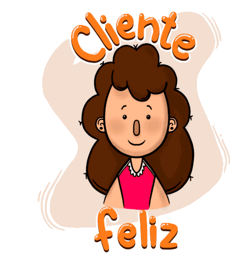 A cheerful cartoon woman with brown curly hair smiles broadly, hands clasped, expressing extreme happiness as a satisfied customer.