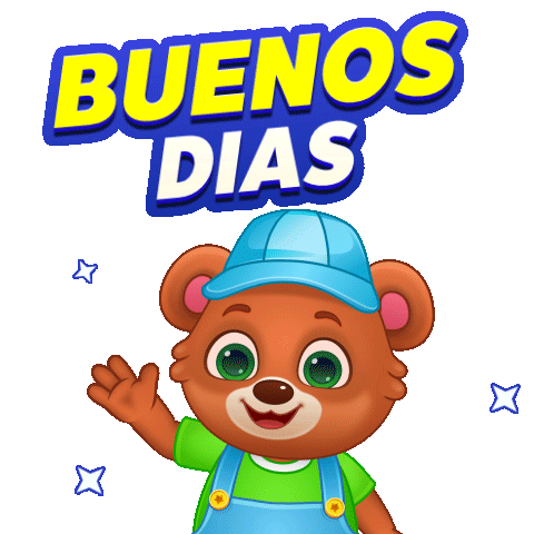 a teddy bear wearing a blue hat and overalls is waving in front of a sign that says buenos dias