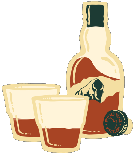 A bottle of Buffalo Trace bourbon whiskey with two shot glasses, ready for a drink or a toast.