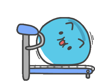 Bugcat, the cute blue blob character, is seen humorously struggling on a treadmill during a workout.