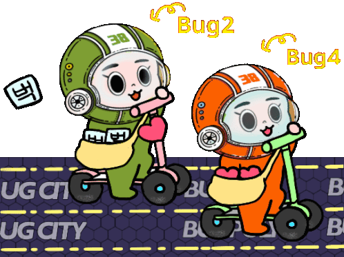 Two adorable Bugcity characters, Bug2 and Bug4, happily ride their scooters, delivering 'bugs' in a vibrant city.
