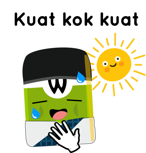 Animated character sweating under the sun, fanning itself, with the text 'Kuat kok kuat' (I'm strong), perfect for Ramadan.