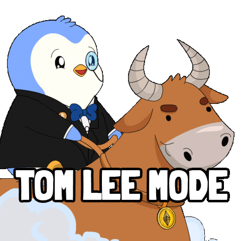 a penguin in a tuxedo is riding on the back of a bull with the words tom lee mode below it