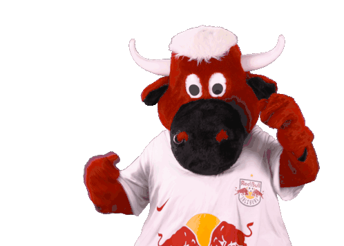 Bullidibumm, the Red Bull Salzburg mascot, playfully adjusts its horns while wearing its team's white jersey.