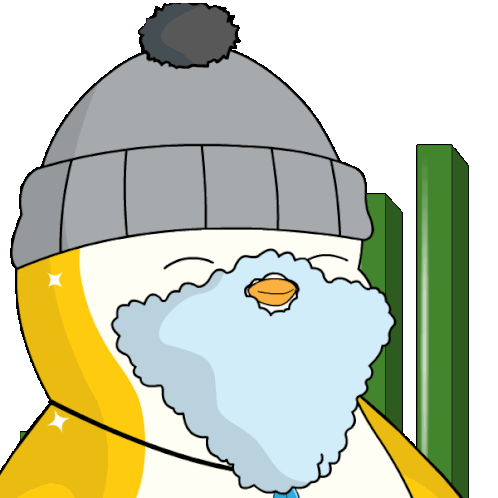 A cartoon penguin with a grey beanie and white beard nods its head, representing a bullish chart trend.