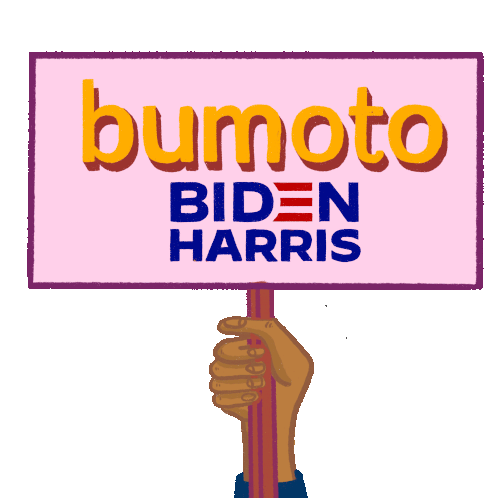 A hand holds a 'Bumoto Biden Harris' protest sign, encouraging Filipino voters to participate in the 2020 US election.