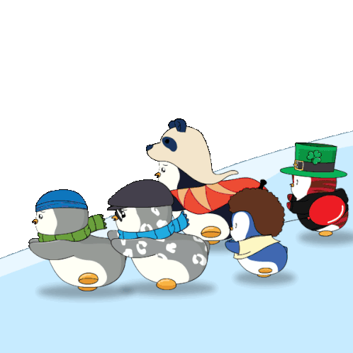a group of penguins wearing hats and scarves are pulled by a dog