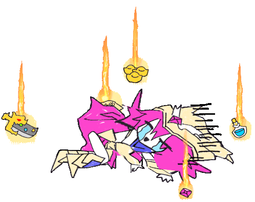 Buro from Muse Dash in a lose animation, lying on the ground with fire effects and divine gear.