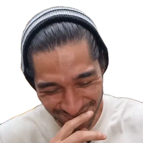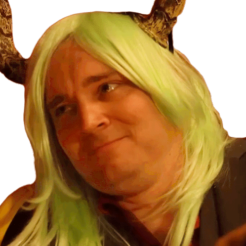 Ivar (Aj Pinkerton) from Random Encounters bursting out laughing with green hair and horns, eyes closed in amusement.