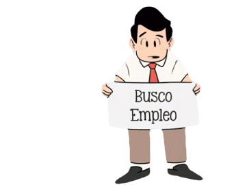 A cartoon man, looking worried, holds a sign that says 'Busco Empleo' (I'm looking for a job), representing unemployment.