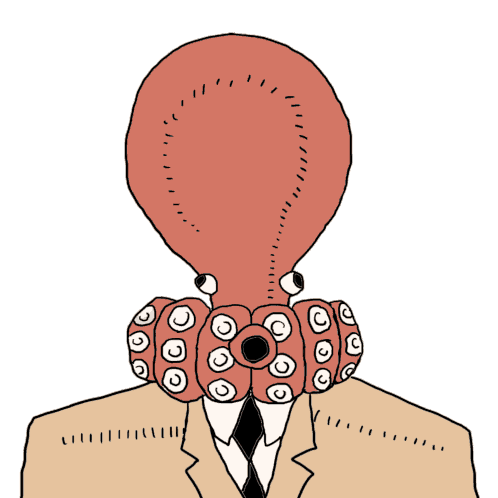 Business Fish Quan, a cartoon character with an octopus head, is depicted in a suit, spitting black ink.