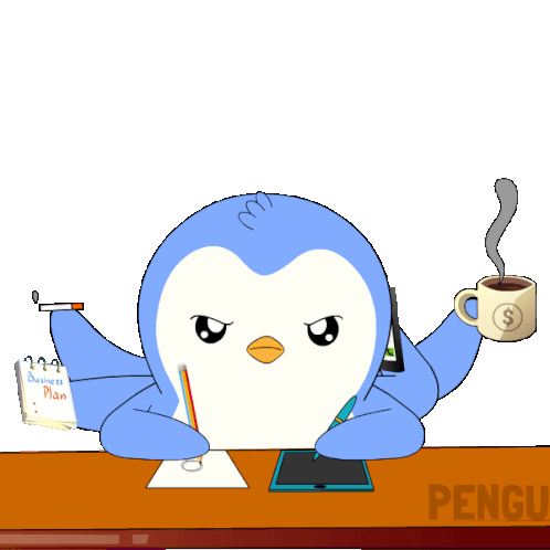 a penguin sitting at a desk with a cup of coffee