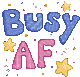 Animated pixel art sticker displaying the phrase 'Busy AF' with stars and confetti, conveying a feeling of being extremely occupied.