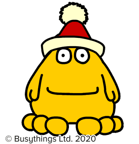 The Busythings Yellow Monster, wearing a Santa hat, roars with excitement, celebrating a very Happy Christmas!
