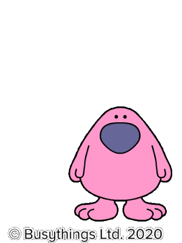Busythings Pink Man celebrates with a joyful jump and whoop, expressing excitement and happiness with an energetic movement.