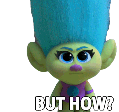 A Trolls character with blue hair looks surprised, mouth open, asking 'BUT HOW?'. Expresses confusion or a need for explanation.