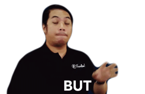 A man in a black shirt says 'BUT' while gesturing with his hands, emphasizing a point or a contrast.