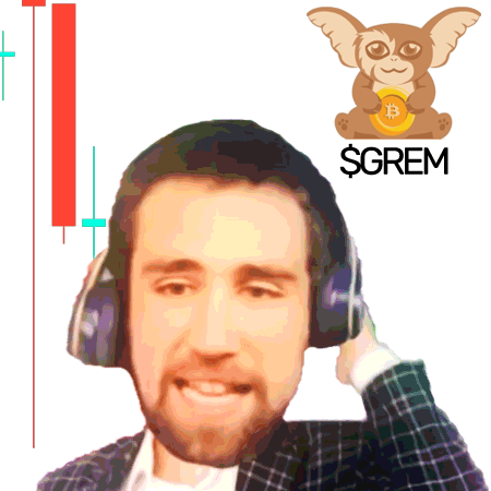 A man with headphones encourages viewers to "BUY THE DIP!" amidst a falling crypto chart, featuring a $GREM gremlin.