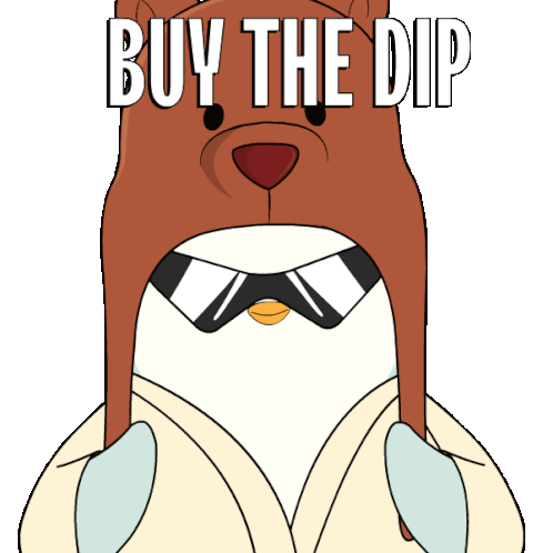 A cool penguin in a bear hat and sunglasses encourages buying the dip in stocks and crypto markets.