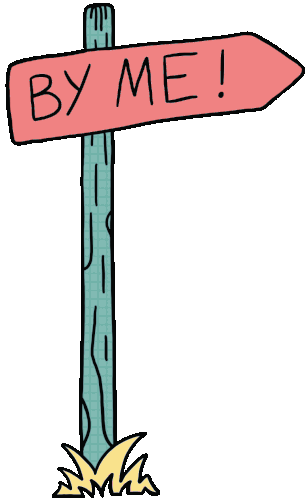 A cartoon wooden arrow sign pointing right, with the phrase "BY ME!" written on it, standing in grass.