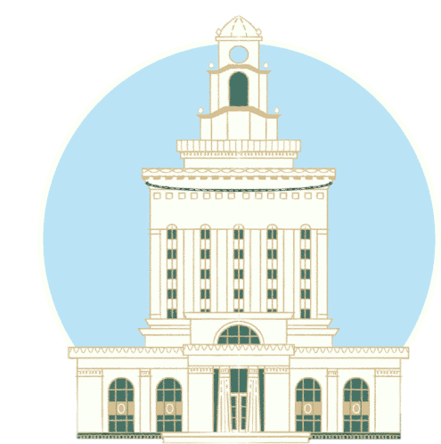 An animated illustration of a government building in Oakland, California, featuring a banner that reads 'By The People Of Oakland For The People Of Oakland'.