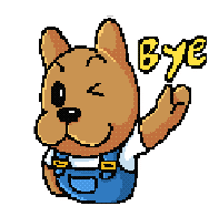 A cute pixel art dog character in overalls winks and waves goodbye, with 'Bye' text. Features the 88 sticker.