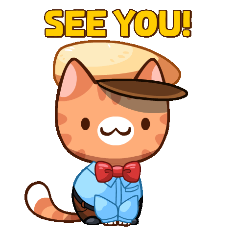 A cute cartoon cat wearing a hat and bow tie waves goodbye with the text 'SEE YOU!' displayed above.