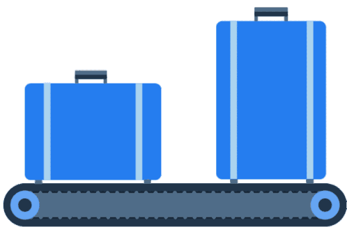 Animated sticker showing blue suitcases moving on an airport luggage conveyor belt, symbolizing departure and travel.