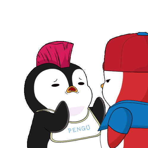 A penguin with a pink mohawk and bib waves goodbye to another penguin, expressing a hurried departure or farewell.