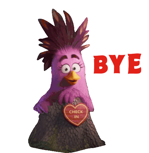 Pinky from The Angry Birds Movie 2 waves goodbye with a cheerful expression, accompanied by the word 'BYE'.