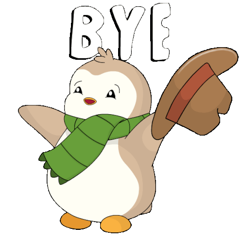 A cute pudgy penguin wearing a green scarf and brown hat waves goodbye with a friendly 'BYE' message.