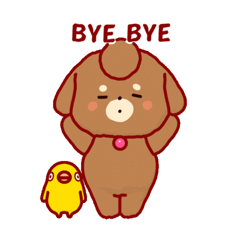 A cute brown dog and a yellow chick wave goodbye, with 'BYE BYE' text appearing above them, expressing a cheerful farewell.