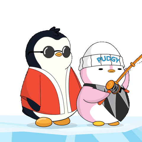 two penguins are standing next to each other with one wearing a pudge hat