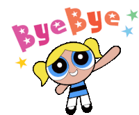 Bubbles from The Powerpuff Girls waves goodbye with a cheerful smile, surrounded by colorful stars and 'Bye Bye' text.