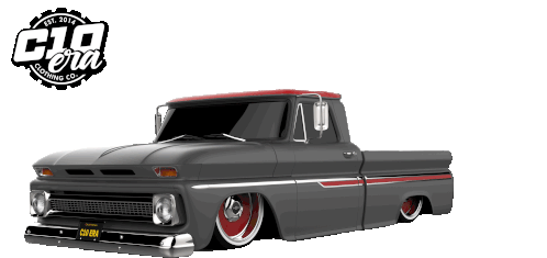 A sleek, lowered Chevrolet C10 truck featuring C10Era and GSI branding, with a red roof and side stripe.