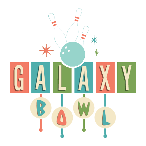 A vibrant retro-style logo for 'GALAXY BOWL' featuring bowling pins, a ball, and colorful block letters.