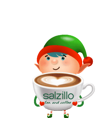 A festive Christmas elf holds a Salzillo coffee cup with heart latte art, moving it up and down with changing expressions.