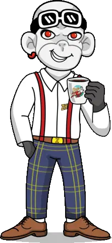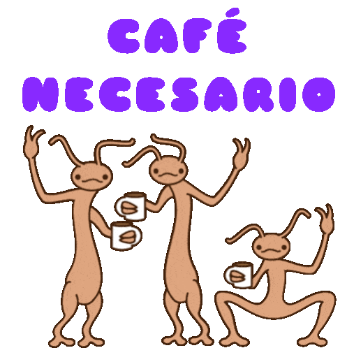 Three quirky alien creatures enjoying their "Café Necesario" (Necessary Coffee), holding mugs and looking content.