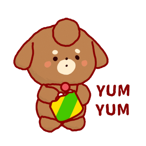 A cute brown cartoon dog character happily eats snacks from a bag, exclaiming 'YUM YUM' with delight and satisfaction.